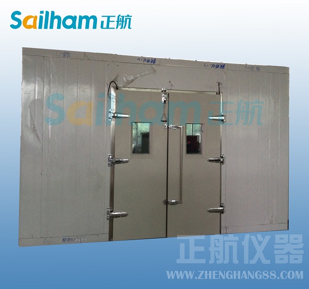 三、    在步入式高低温试验室加上了一些方便便利的装置,箱门去掉了原先,改用了单片门,单窗口,左开。平面嵌入式把手,双道隔热气密迫紧,有效隔绝箱体内外热交换。观测窗采用了三层真空玻璃,便于观察试品使用,添加高亮度视窗照明灯,便于观察试品。